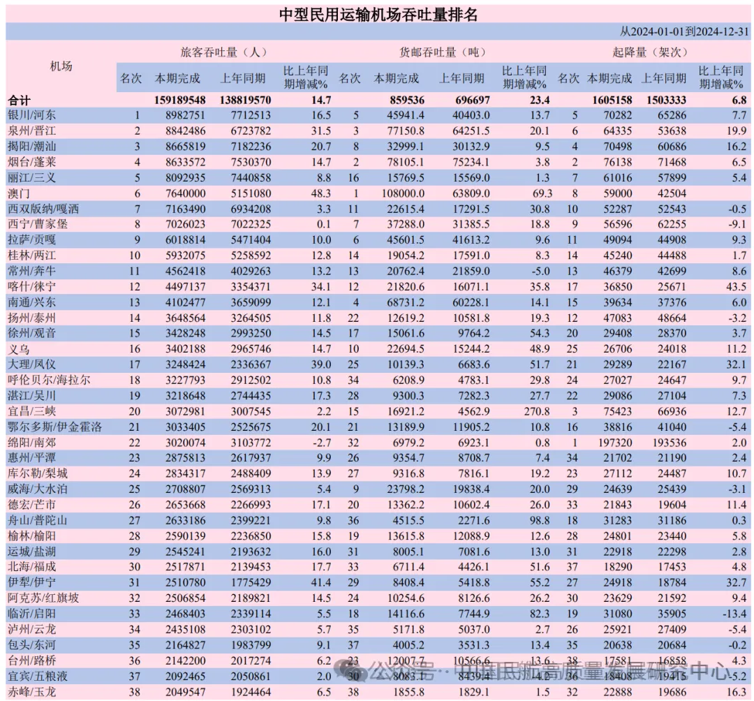 关于民航机场(AIR Port),2024年机场旅客吞吐量、货邮吞吐量和起降架次同比增加约16%、19%和10%,增速远超全国GDP增速。大型民航机场中,上海浦东夺得旅客吞吐量、起降架次两项第一名以及货邮吞吐量第二名,香港超过上海浦东夺得货邮吞吐量第一名、旅客吞吐量第六名,广州白云夺得旅客吞吐量、起降架次两项第二名以及货邮吞吐量第三名,北京首都获得旅客吞吐量、起降架次两项第三名,鄂州花湖机场以86.52万吨获得货邮吞吐量第六名。中型民航机场中,银川河东、泉州晋江两机场获得旅客吞吐量前两名,澳门、烟台蓬莱机场获得货邮吞吐量前两名,绵阳南郊、烟台蓬莱机场获得起降架次前两名,而澳门机场旅客吞吐量、货邮吞吐量和起降架次同比分别增长48%、69%和41%,增速惊人。在小型民航机场中,张家界荷花、芜湖宣州和洛阳北郊机场分别获得旅客吞吐量、货邮吞吐量和起降架次第一名。