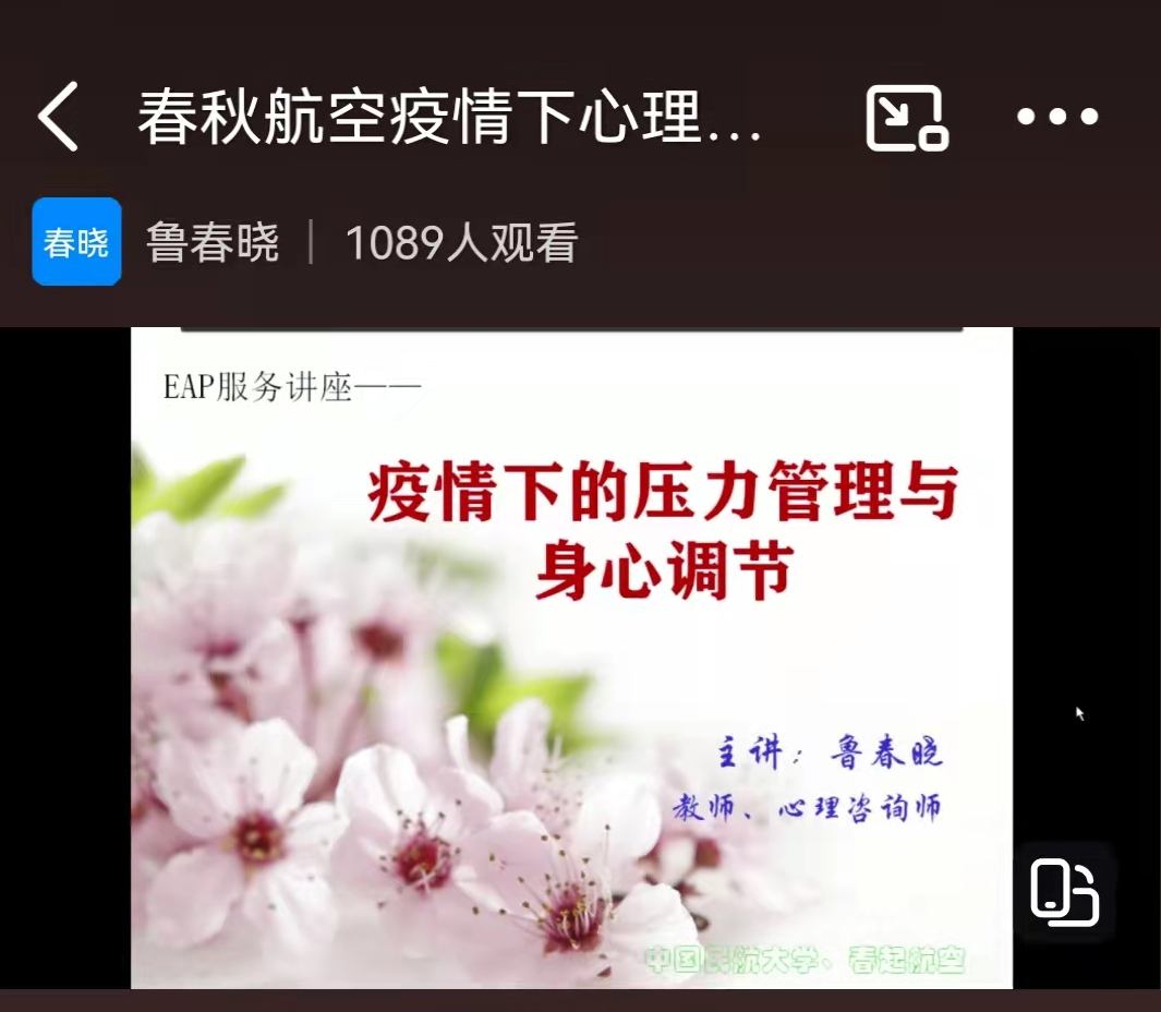 2022年4月15日,安全科学与工程学院人因工程系鲁春晓老师应邀为春秋航空公司做了一场名为“疫情下的压力管理与身心调节”的线上EAP心理援助讲座,旨在通过正确科学的心理学方法帮助民航一线员工度过心理难关。