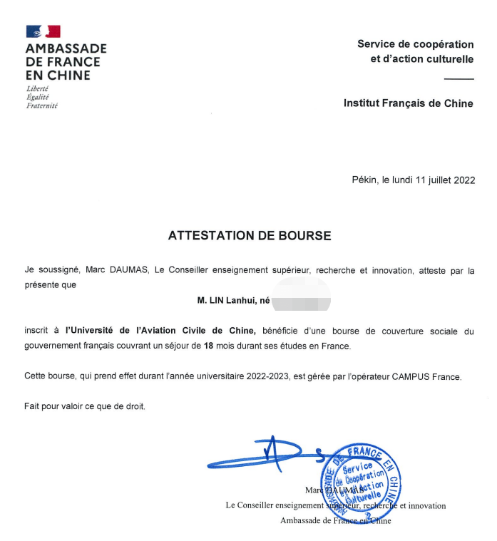 自2019年起,我校与法国驻华大使馆合作开展法国政府-高校合作奖学金“France Science Excellence”项目,迄今为止,已有11名学生获此殊荣。成功申请奖学金项目的同学将享有法国政府社会保险奖学金所提供的福利,同时他们还将享有法国本土大学生身份所享受的优待,包括免费参加全民社会保险等。