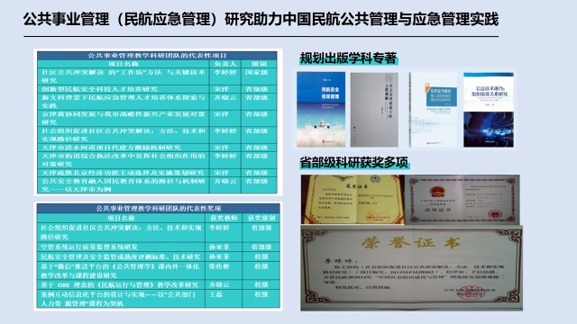 科研水平:专业教师主持及参加国家自然基金、国家社科基金、国家科技部重大项目10余项,教育部人文社科项目、天津市社科规划项目、天津市教育科学规划项目、天津市科技战略计划项目、天津市决策咨询项目、民政部部级课题项目、民航安全能力项目等各种省部级项目30余项;