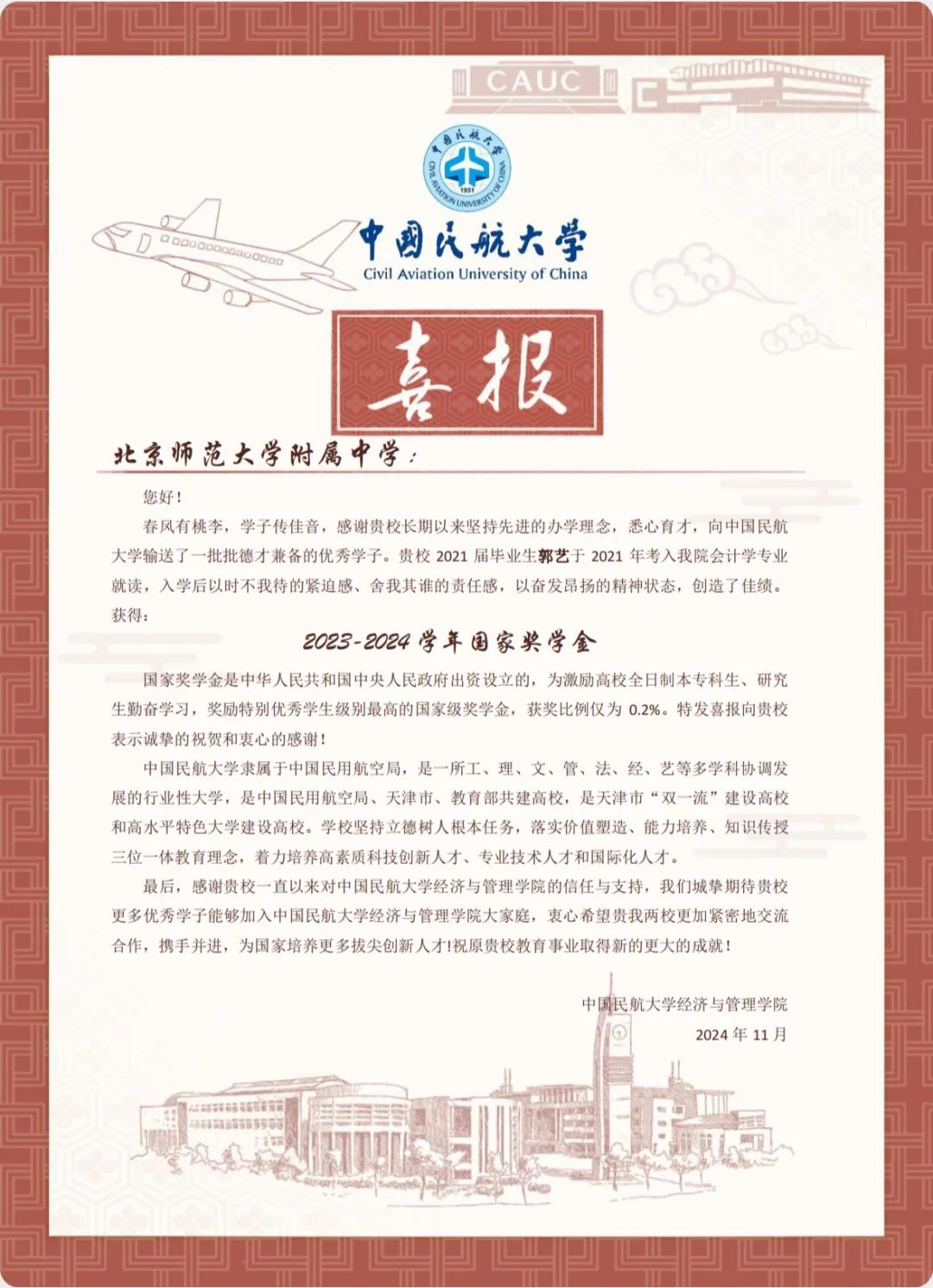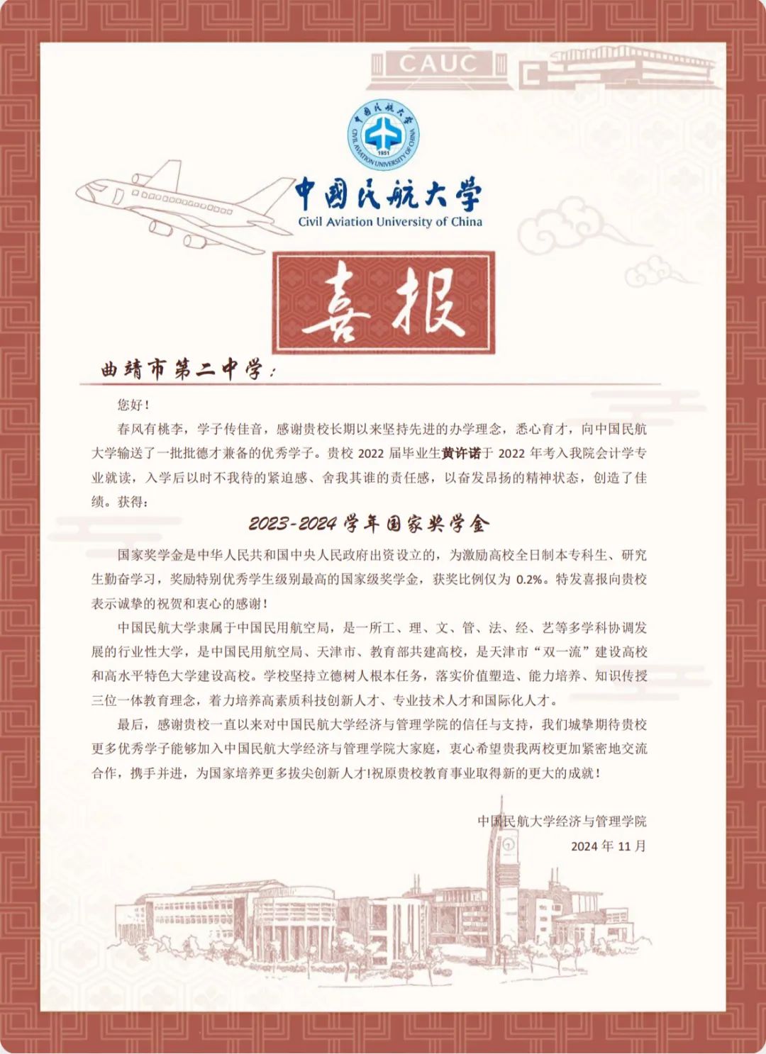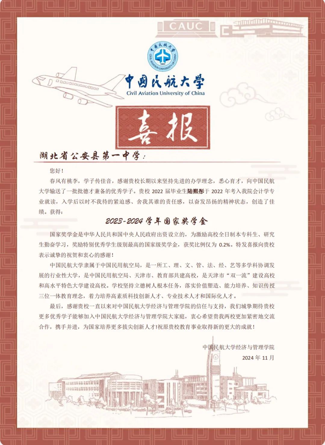 喜报虽小,却蕴含无上荣光。一封封喜报既承载着家庭的教育、学校的栽培、个人的努力,也承载着对家庭和高中母校的真诚问候和对学生成长的由衷喜悦,是学校资助育人成果的全面展现。喜报寄送活动是学校深化资助育人工作、强化家校协同育人的一项有效举措,架起了家校社互通“连心桥”。一直以来,我院坚持落实立德树人根本任务,坚持把资助、育人、服务贯穿始终,积极搭建家校社共育有效平台,探索完善发展型资助工作模式,丰富资助育人工作内涵,切实提升资助育人实效。今后,我院将坚持育人导向,将育人作为资助工作的出发点和落脚点,着力构建同频共振、同向发力、双向奔赴的高质量家校社携手共育长效机制,助力学生成长成才、全面发展。