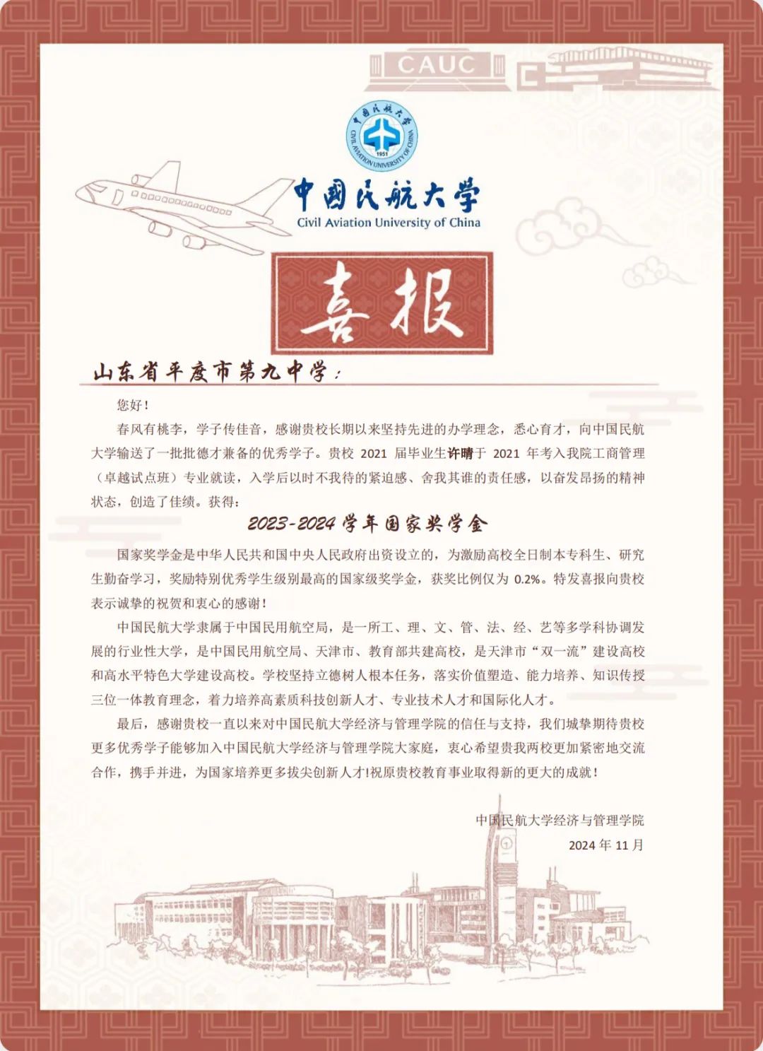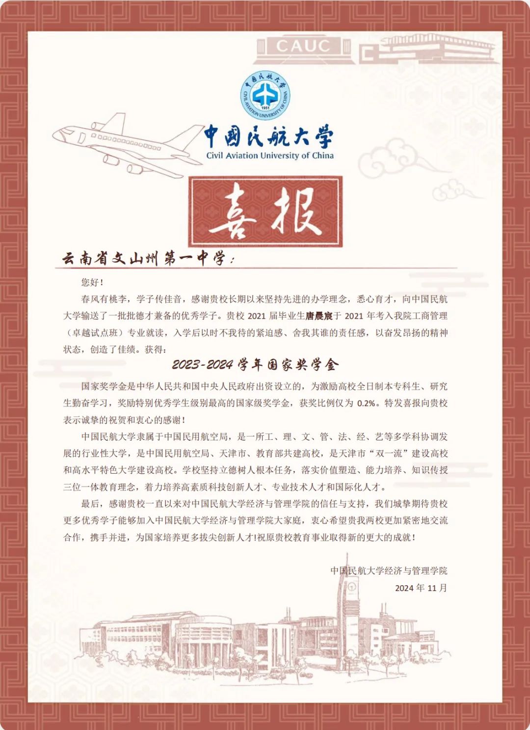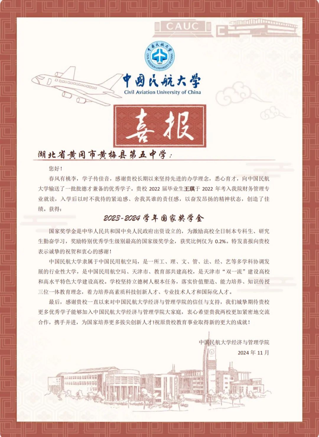 喜报虽小,却蕴含无上荣光。一封封喜报既承载着家庭的教育、学校的栽培、个人的努力,也承载着对家庭和高中母校的真诚问候和对学生成长的由衷喜悦,是学校资助育人成果的全面展现。喜报寄送活动是学校深化资助育人工作、强化家校协同育人的一项有效举措,架起了家校社互通“连心桥”。一直以来,我院坚持落实立德树人根本任务,坚持把资助、育人、服务贯穿始终,积极搭建家校社共育有效平台,探索完善发展型资助工作模式,丰富资助育人工作内涵,切实提升资助育人实效。今后,我院将坚持育人导向,将育人作为资助工作的出发点和落脚点,着力构建同频共振、同向发力、双向奔赴的高质量家校社携手共育长效机制,助力学生成长成才、全面发展。