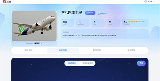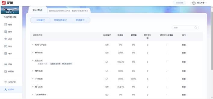 《飞机性能工程》以超星平台为依托,建立知识图谱实现混合式教学,包含知识点750个,知识关系3个,教学资源1375个,关联试题数405个。