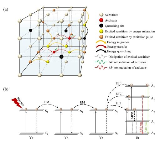 镧系元素上转换发光(UCL)指在较长的近红外光源激发下产生紫外到短波近红外光的发光现象。它不仅可产生基于发光光谱和寿命调控的多维光学信息,而且由于源于4f轨道电子的组态内跃迁而具备很高的光稳定性和安全性。近些年,研究者们投入了大量精力来获取基于纳米结构的UCL光学特性调控。尽管取得了可喜的成就,但纳米级光信息的精确控制需要合理设计结构内的能量交换路径,这无疑依赖于UCL动力学和荧光寿命研究。