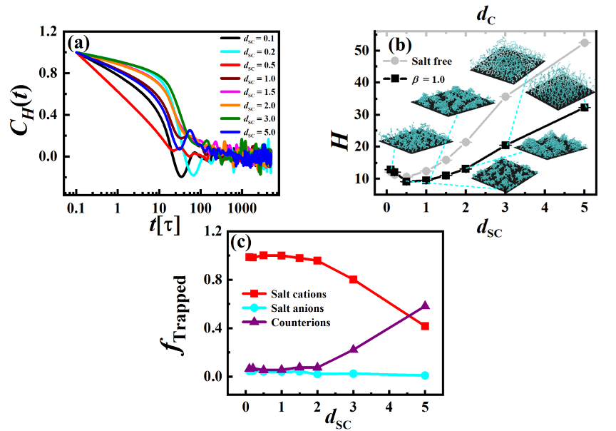 研究还首次揭示了阳离子动态行为的特异性:当盐浓度较低时,小尺寸阳离子倾向于单链吸附,限制链单体运动;大尺寸阳离子通过链间桥联形成多链聚集体结构,接枝链在不同聚集体间的跳跃增强了单体扩散系数。模拟结果为理解离子-高分子复杂相互作用提供了新视角,并为设计多价盐响应智能材料(如可调润滑涂层、靶向药物载体)奠定了理论基础。