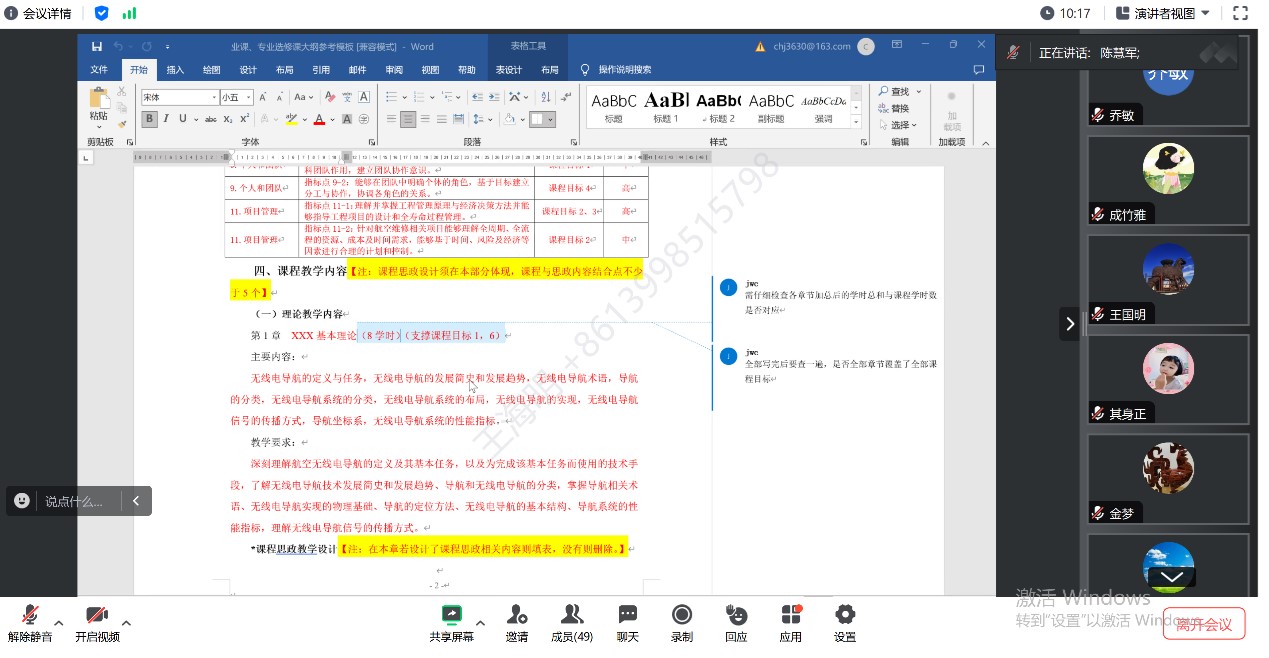 当晚20:00,马克思主义学院又以线上方式召开了课程大纲修订推动会。院领导、教务科、教研室主任以及课程负责人等共计50人参会。会上,主管教学副院长强调了教学大纲修订和本科教育教学评估迎评工作的极端重要性,通报了上午评审会的情况,并部署了下一步的教学大纲修订工作安排。