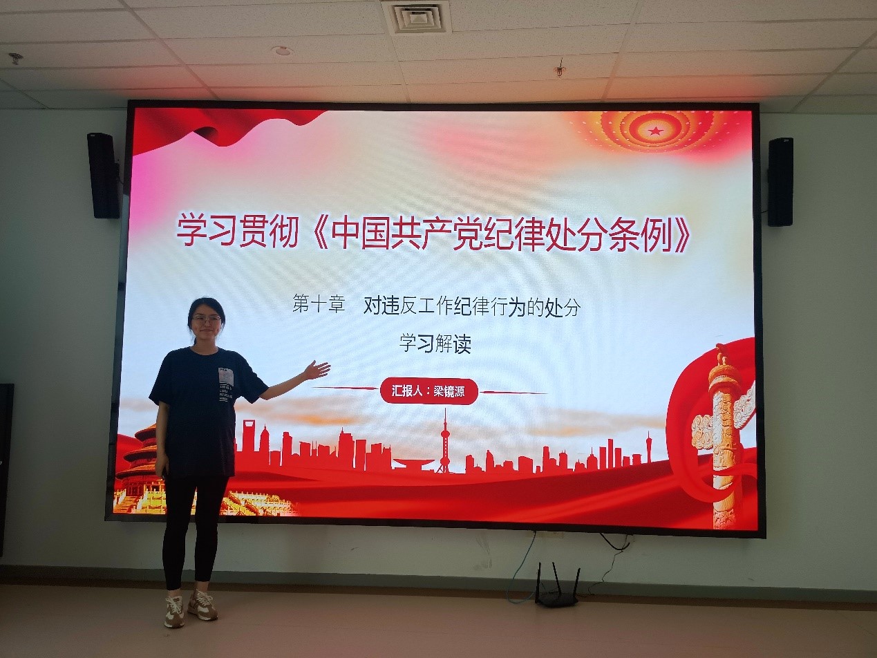 为推进《中国共产党纪律处分条例》学习走深走实,本支部将党纪学习教育内容进行分解,结合党支部教师党员专业及研究背景,将党的政治纪律、组织纪律、廉洁纪律、群众纪律、工作纪律、生活纪律六方面内容分解到个人,以党课形式呈现。后续将按照既定要求和目标持续推动党纪学习教育开展。
