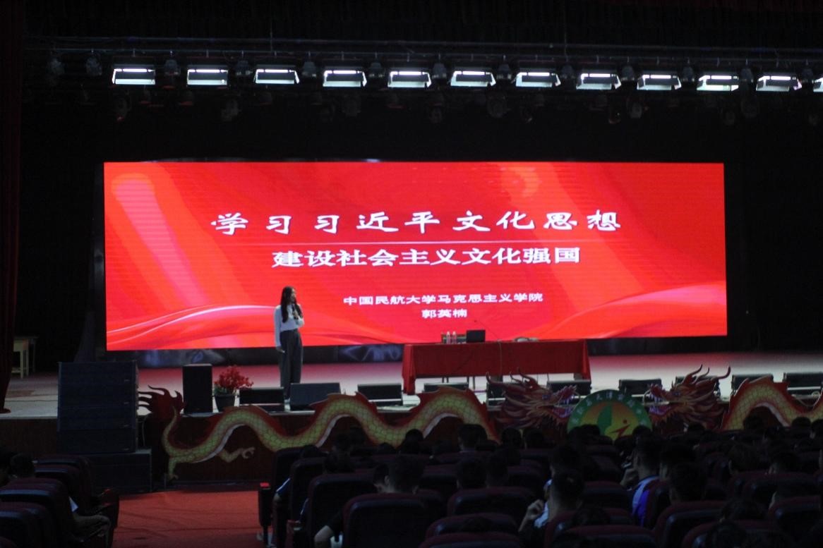 郭英楠老师以同学们耳熟能详的歌曲作为导入,将同学们的注意力第一时间吸引到课堂,从而引出本次宣讲的主题。具体内容围绕以下三个方面展开:为什么说文化是民族生存和发展的重要力量;新时代建设社会主义现代化强国有何战略环境条件;如何建设社会主义现代化强国铸就社会主义文化新辉煌。
