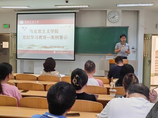 会议伊始,学院党委副书记以案例警示的方式,深入浅出地阐述了党员教师在教育教学中的党纪要求。他要求党员教师须将党纪规范落实到课堂管理,课程考核、试卷评阅、成绩管理等具体工作中,严肃教学和考试工作纪律。他还特别强调了思政课党员教师发挥表率作用的重要性。他指出,作为党的理论宣传者和实践者,思政课教师更应该以身作则,严守党的政治纪律和政治规矩,不断提高自身党性修养和业务能力,真正成为学生的引路人。