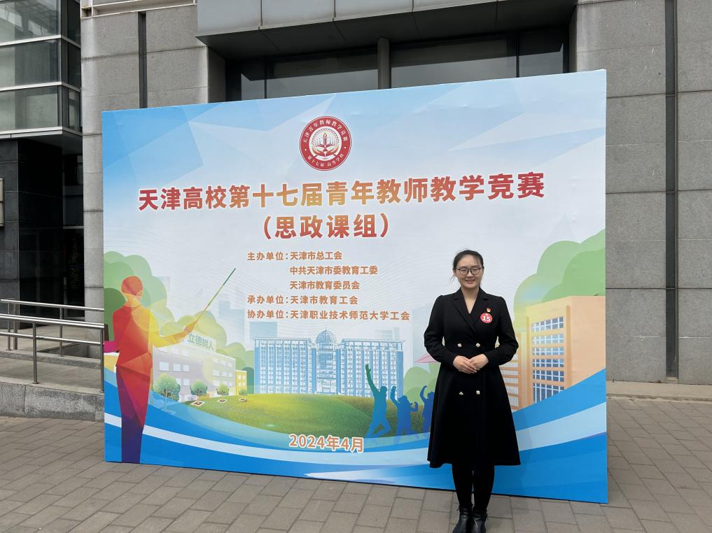 2023年12月,经过市级预选赛评比,张慧捷顺利晋级第十七届青年教师教学竞赛决赛。2024年4月,天津高校第十七届青年教师教学竞赛(思政课组)决赛在天津职业技术师范大学举行。比赛共分教学设计、教学展示、教学反思三个部分,张慧捷老师充分展现出马克思主义学院思政课教师的风采,荣获思政课组一等奖、最佳教学设计奖。
