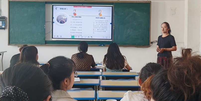 紧接着镜头切换到策勒县第一中学高一年级物理教师卡日买提,在学校高空坠物警示牌与“鸡蛋坠落”试验的引导下,她带领听课教师们走入了“重力势能”的知识世界。通过卡日买提的精心设计和详细推导,重力做功、重力势能、WG与EP的关系、重力势能的相对性等晦涩难懂的概念逐渐得以拨云见日,物理知识的魅力在卡日买提的讲解中得到了充分显现,现实生活中的具体科技应用案例彰显出教师在探索课程思政中的重要突破。