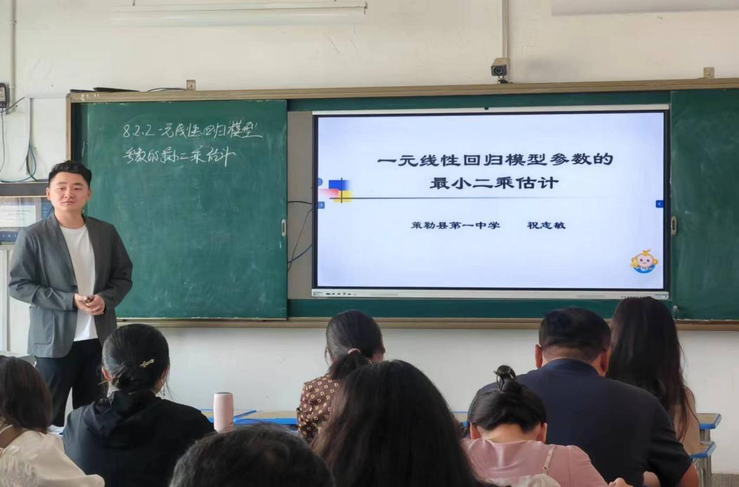 经过短暂的休息,在策勒县第一中学多媒体录播室的讲台上,策勒县第一中学高二年级数学教师祝志敏又为大家带来了一场精彩的数学示范教学展示。在授课的过程中,祝志敏结合具体实例,围绕“通过父亲身高推测儿子身高”这一经典案例,带领听课教师了解了一元线性回归模型的含义、模型参数的统计意义、最小二乘原理等基础概念,与此同时又进一步介绍了应用该理论的相关统计软件以及如何利用线性回归模型研究变量之间的关系并进行预测的实用性问题,同样紧紧围绕课程思政的基本元素。