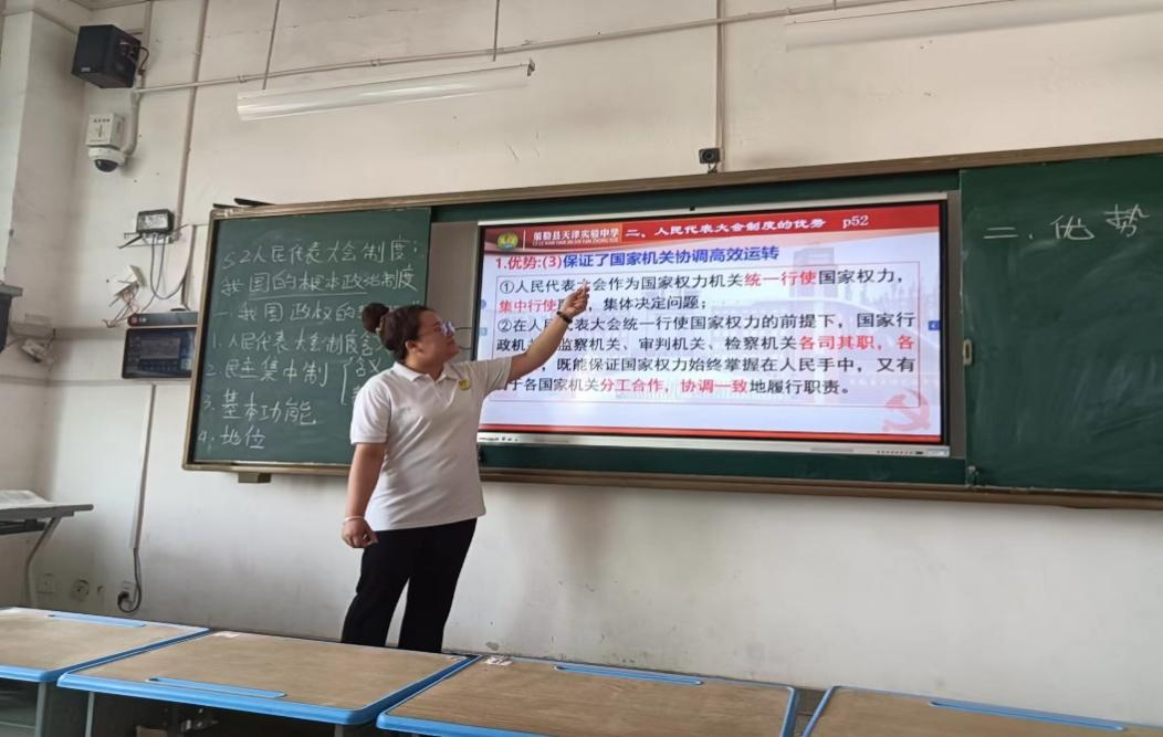 活动伊始,策勒县第一中学高一年级政治教师阿曼古丽,在学校多媒体录播室,讲授了一场精彩的思政课程。结合高一政治教学中的重难点问题,阿曼古丽选取《政治生活》中“人民代表大会制度”这一部分内容,通过巧妙的课堂导入将授课核心进行聚焦,结合中美政权特点等学生十分感兴趣的焦点案例,讲述了人民代表大会制度与人民代表大会的区别,人民代表大会制度的含义、地位、基本功能、优势以及民主集中制等问题,并通过“班班通”转播到学校其他班级,为政治课教师作出了一次经典的示范,起到了重要的模范带头作用,对于政治学科的进一步发展具有重要意义。