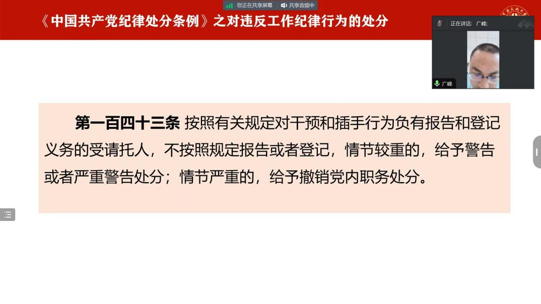 首先,张慧捷简要介绍了新修订的《中国共产党纪律处分条例》第十章“对违反工作纪律行为的处分”部分的基本情况。违反工作纪律的行为主要包括以下几类:工作失职;搞形式主义、官僚主义;相关工作中不履行或者不正确履行职责;滥用问责或者问责工作中严重不负责任;统计造假;违规干预和插手;泄露组织秘密;涉外工作违规等。随后,张慧捷借助党纪教育案例领学《中国共产党纪律处分条例》第十章第一百三十条至一百三十九条相关内容。