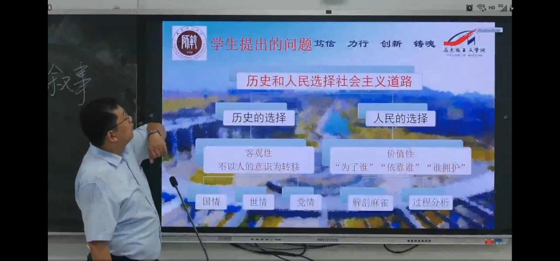 具体到教材第八章内容,李老师分享了他是如何讲授这一章内容的。在他看来,关键是要讲清楚道路选择的历史叙事,以“国情、世情、党情”入手讲清楚“历史的选择”强调客观性,不以人的意志为转移;以“解剖麻雀、过程分析”入手讲清楚“人民的选择”强调价值性,即最广大人民的根本利益,“为了谁”“依靠谁”“谁拥护”等;并且还要讲好社会主义选择的前传,比如“新中国新在哪”“抗美援朝战争”相关内容等,以此说明选择社会主义不是单向度、不是主观的等等,要以理服人,以情动人,让学生自然而然的信服。