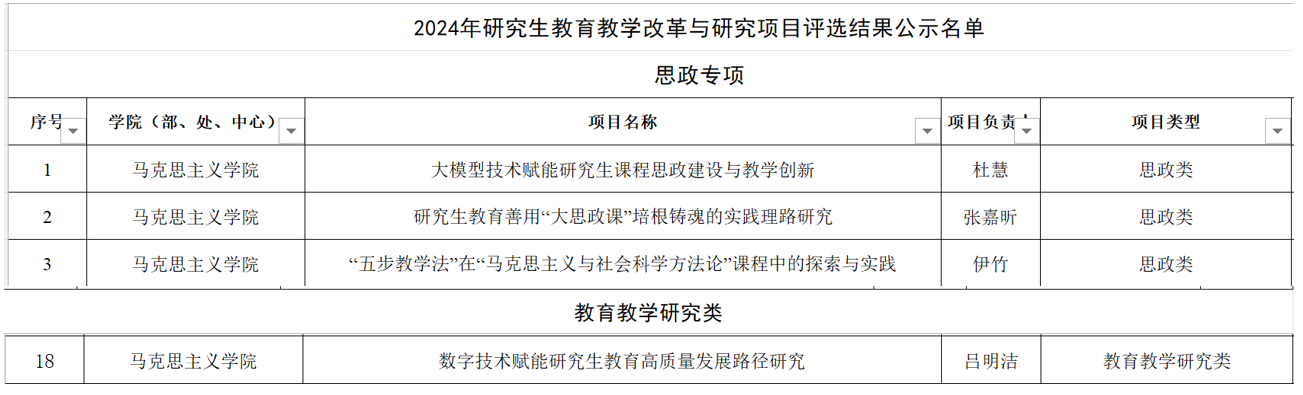 近日,研究生院公布2024年研究生教育改革与研究项目立项评选结果,马克思主义学院获批四项。张嘉昕:研究生教育善用“大思政课”培根铸魂的实践理路研究;杜慧:大模型技术赋能研究生课程思政建设与教学创新;伊竹:“五步教学法”在“马克思主义与社会科学方法论”课程中的探索与实践;吕明洁:数字技术赋能研究生教育高质量发展路径研究。