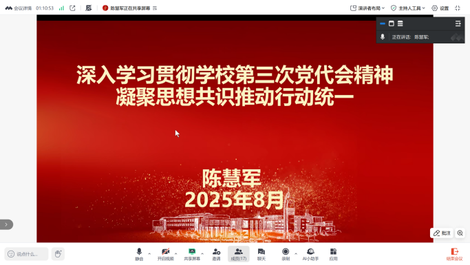 8月22日下午思想政治教育系党支部围绕“学习宣传贯彻第三次党代会精神”主题开展了一次线上政治理论学习,全体教职工党员和思政专业学生党员参加了此次集体学习。