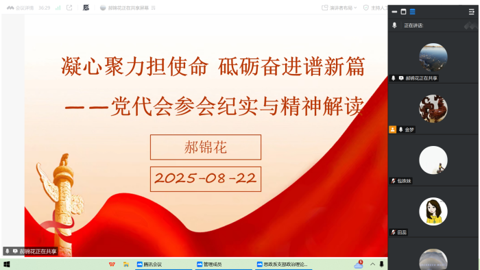 陈慧军老师结合宣传思想文化工作介绍了党代会召开期间氛围营造的创新实践和文化活动开展的特色成果,并运用思维导图对党代会报告进行了全面细致的解读,勉励青年师生在建设中国特色、世界一流民taptap点点注册账号学的征程中贡献青春力量。