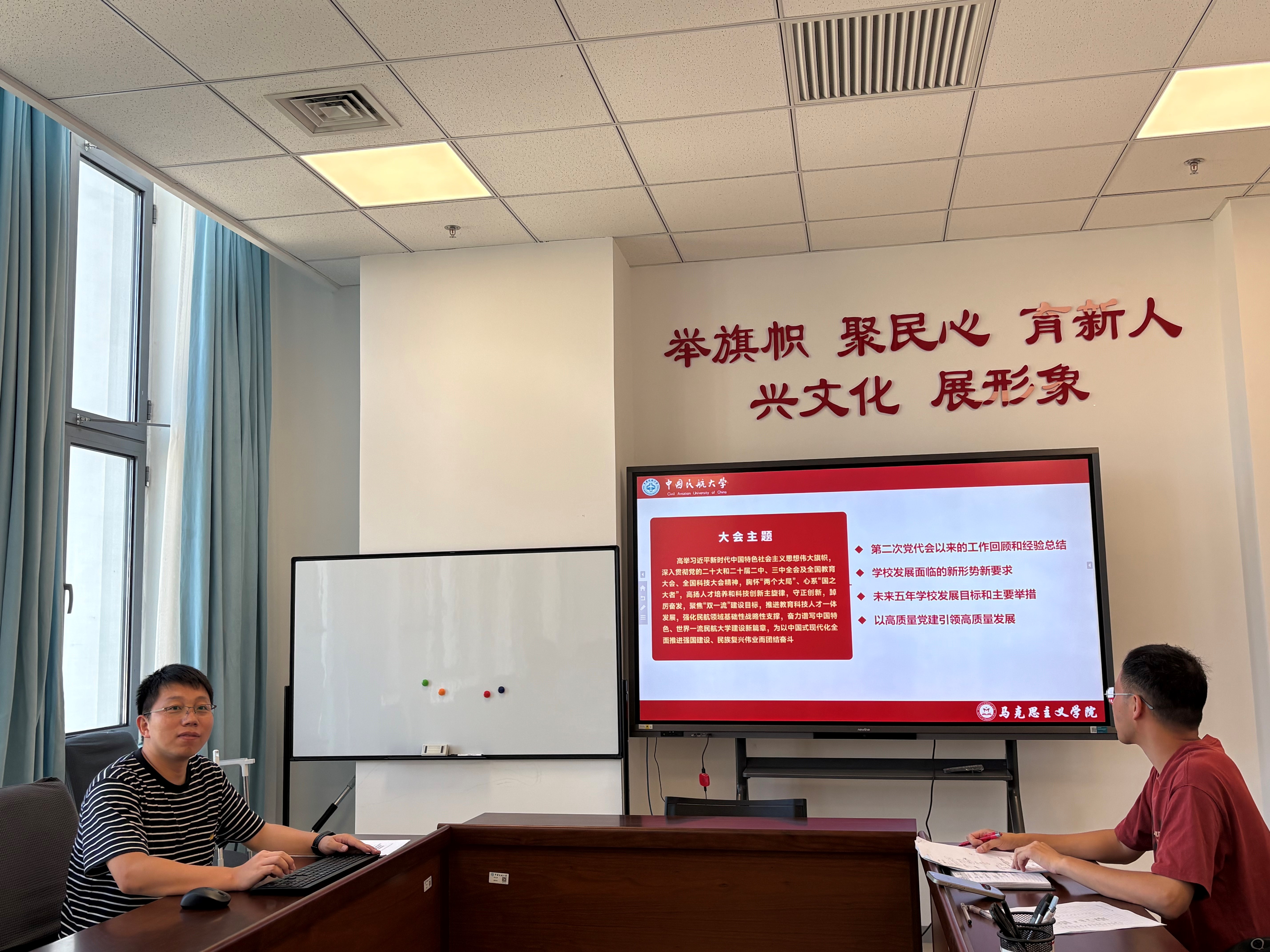党支部副书记石志强老师作为第三次党代会代表,在暑期期间曾向支部成员传达了第三次党代会精神。这次在开学第一天,石老师带领大家再次深入学习贯彻第三次党代会精神。石老师从多个维度进行了全面解读,首先回顾了第二次党代会以来学校在教育教学、科研创新、人才培养等方面取得的显著成就,总结了宝贵经验,让大家深刻认识到学校发展的坚实基础与强大动力。随后,石老师分析了学校发展面临的新形势新要求,指出在国内外教育环境不断变化的大背景下,学校需要积极应对挑战、把握机遇,实现高质量发展。最后,石老师详细阐述了未来五年学校的发展目标和主要举措,强调以高质量党建引领高质量发展,为学校各项事业进步提供坚强的政治保障。通过这一环节的学习,教研室成员进一步增强了党性修养,明确了自身的责任与使命,为将第三次党代会精神融入到日常教学与科研工作中奠定了思想基础。