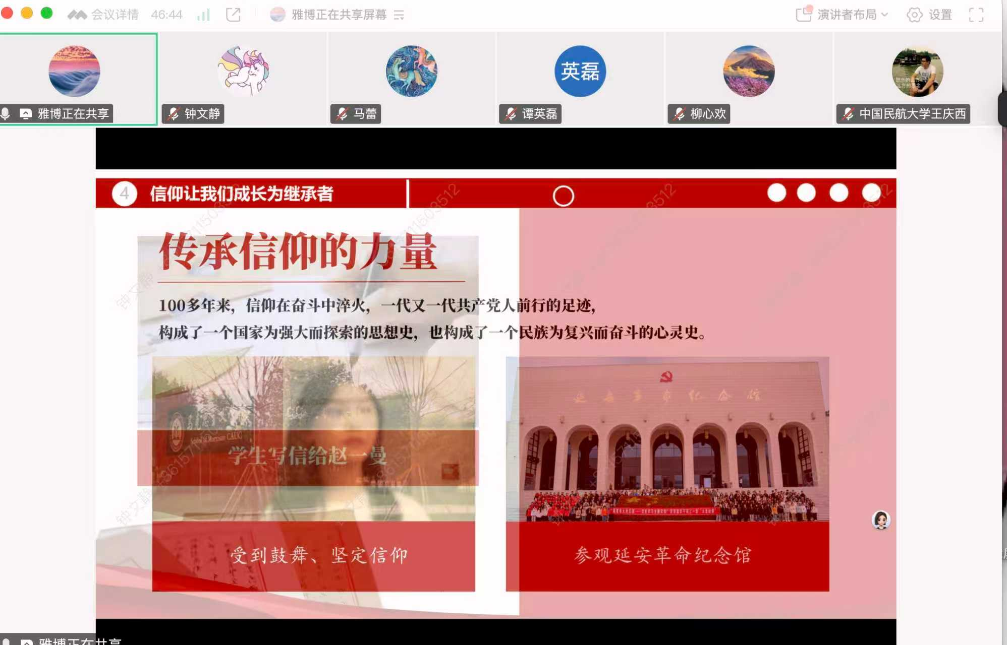 张雅博展示《信中之“信”》教学主题,从天津市女星社名为李一超追求“独立”的一封信的故事讲起,通过她与共产党员、与女星社、与战友的来信,讲述她为何冲出封建家庭、外出求学,加入中国共产党、参加革命,揭秘李一超就是赵一曼。讲清楚理论是信仰坚定的前提,信仰的力量让她拥有更广阔的凝望,真正的信仰奏响她生命最强音,引导学生明白信仰的力量点燃民族的希望。