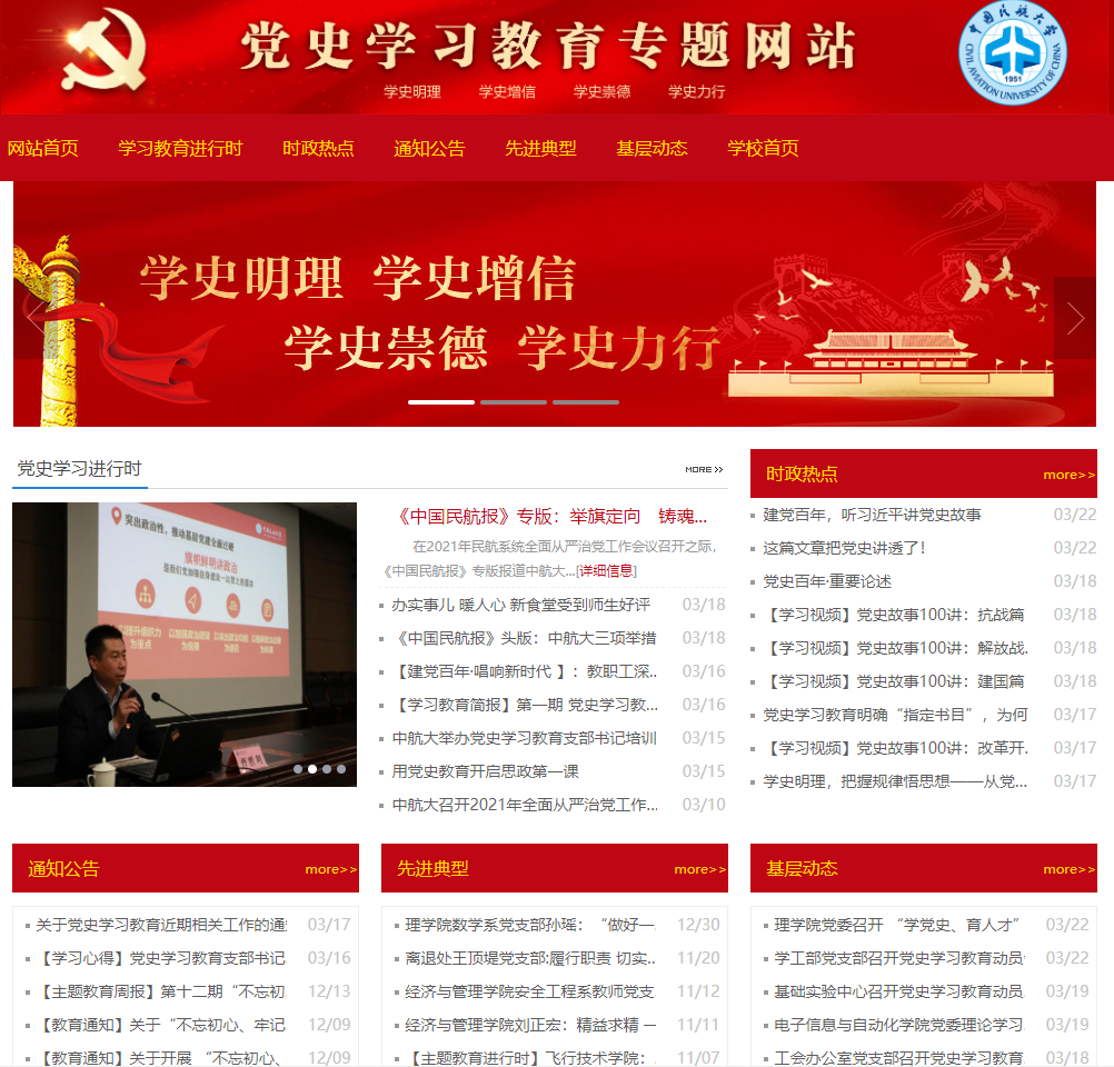 网站立足于融媒体特点,通过图、文、影、音等形式呈现学校各党委(总支)、各党支部在学习过程中的亮点、特色,发掘党员干部立足本职岗位学习党史,实现“学史明理、学史增信、学史崇德、学史力行的目标”学习目标的先进事迹,对基层党组织特色鲜明、成效显著的学习方法、学习成果进行推广。