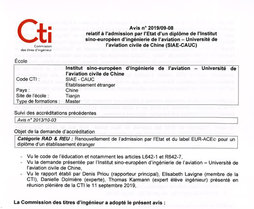 中欧航空工程师学院通过法国工程师学衔委员会评估,获最高等级认证
