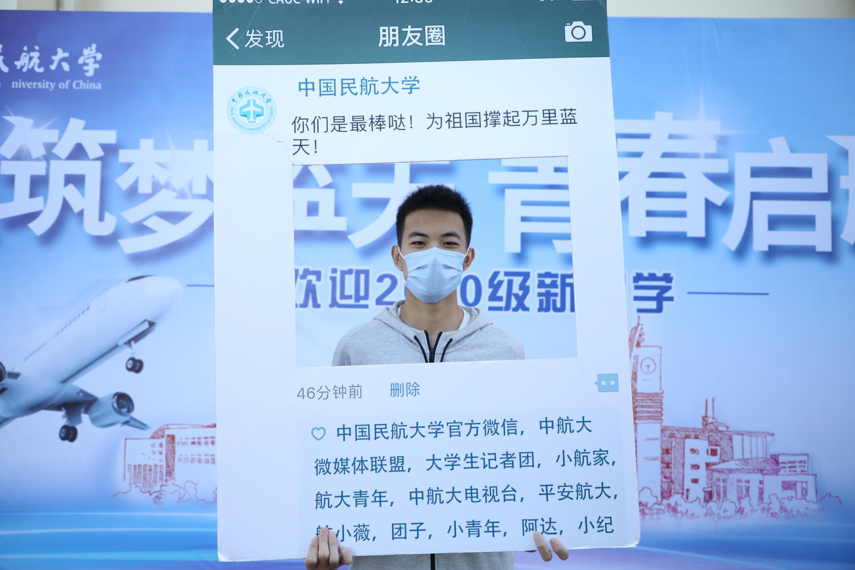 新生与展板合影