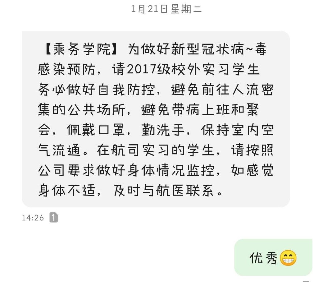 一个人漂泊在外,母校成为了瞿陈露最思念的地方之一,她念念有词着说:“想回去跑操集合,想吃上一次飞行食堂的小笼包,想吃麻辣香锅,想去北四教学楼上自习……”学校和教师们也一直牵挂着在飞实习生们的在外生活。1月21日,瞿陈露收到了来自学校的短信,辅导员和班导师、入党培养人教师先后打来电话关心她和同学们的在飞生活。从1月底开始,通过视频会议,瞿陈露每周都能看到辅导员和班导师,教师们在视频里依次询问每个同学的所在位置、实习情况和身体健康情况;班级里的群聊也是一直活跃,每天都有“老师我刚刚值飞从XX到XX航班,一切平安”的消息。