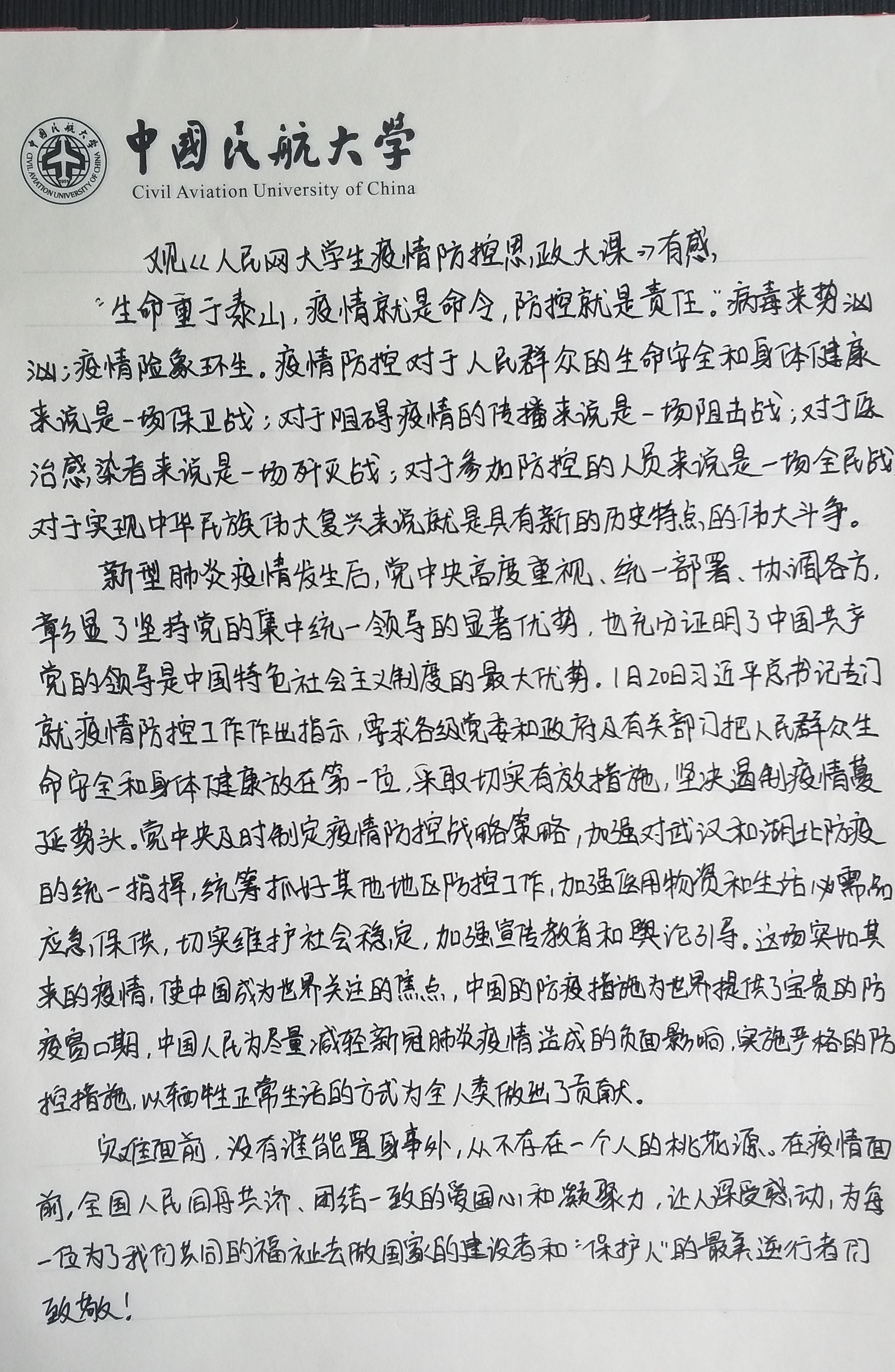 除了报平安的信息,教师和团支书经常在微信群内通知学生利用“青年大学习”“学习强国”等平台学习。3月8日,在学院学生党支部书记的线上组织下,瞿陈露和小伙伴一起在租住公寓完成了教育部社科司与人民网联组织的“全国大学生同上一堂疫情防控思政大课”的视频学习,学生党支部在线上开展热烈的讨论,瞿陈露认真思考,手写下了所思所想。