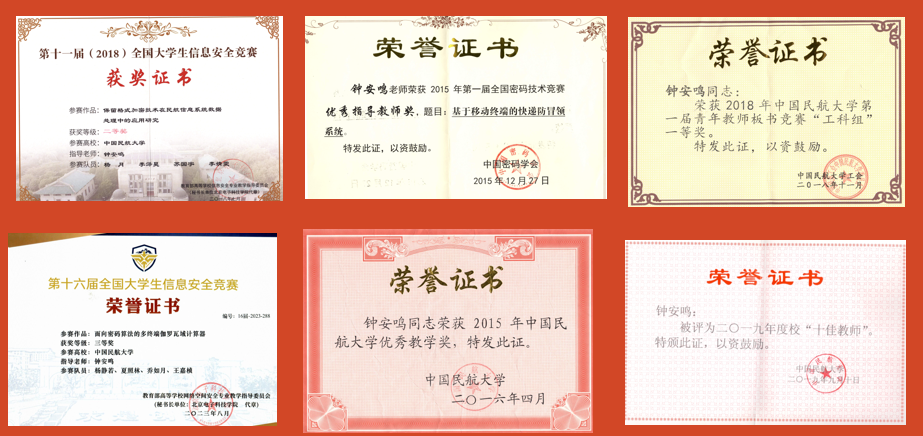 多年来,他刻苦提高自己的专业学术水平和教学能力,先后取得了信息安全等级保护测评师证书和国家注册信息安全专业人员(CISP)证书,参加了多项民航信息安全科研项目,并于2016年赴美国北卡罗莱纳州立大学访学,专门考察学习了美国信息安全和密码学教学的先进经验。