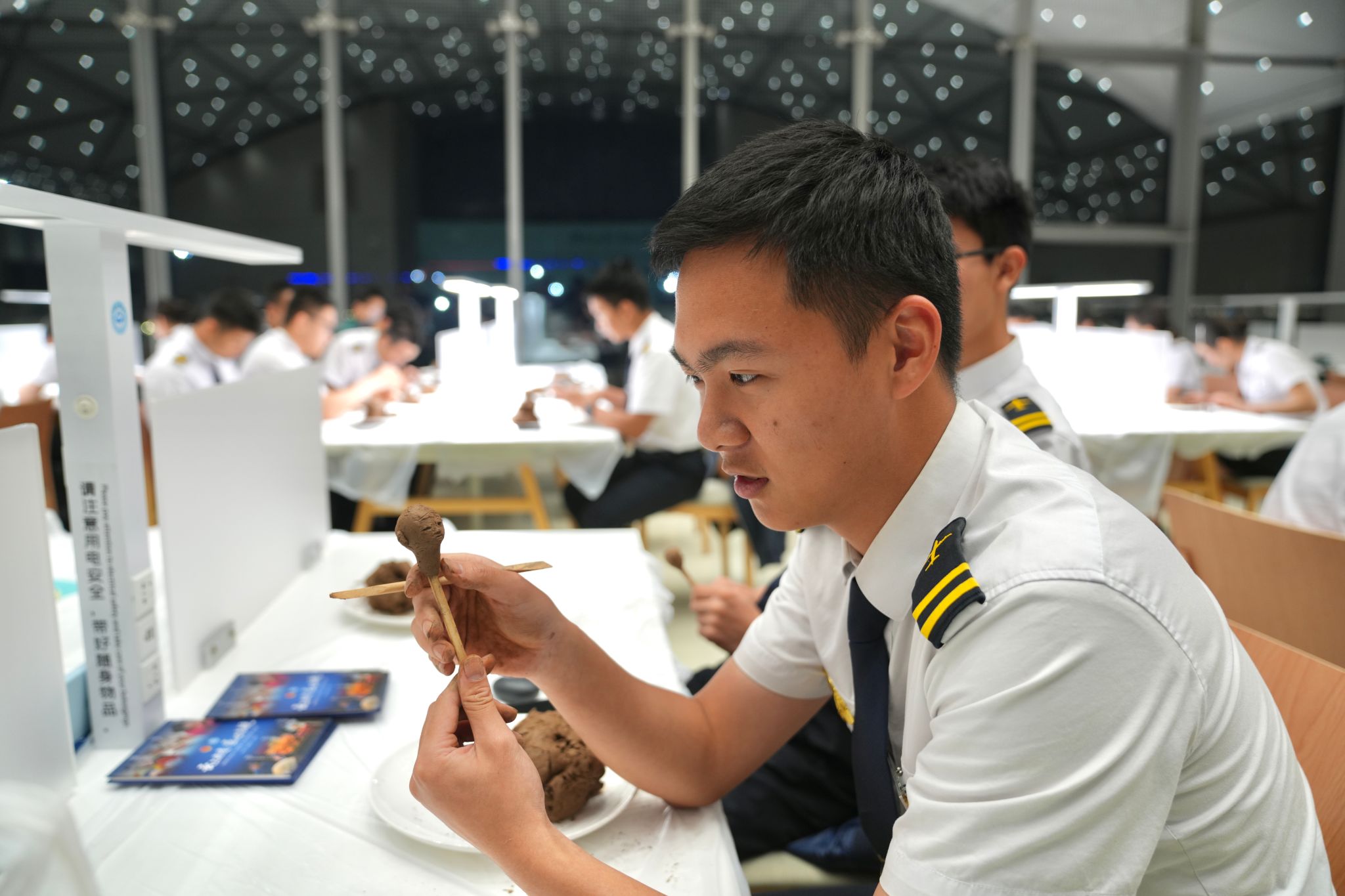 在体验环节,同学们在老师指导下亲自动手制作泥塑,充分发挥想象力,有的塑造校园标志性建筑,有的创作动漫形象,还有的将民航元素与传统泥塑结合,制作出“校徽”“飞机模型”等作品。一件件充满青春创意的作品,既是对“泥人张”传统技艺的致敬,也展现了新时代大学生对传统文化的创新表达。富心悦逐一进行指导,针对捏塑技巧、色彩搭配等细节提出建议,她表示:看到同学们将现代元素与传统工艺结合,让我感受到非遗文化在年轻一代中的生命力。”