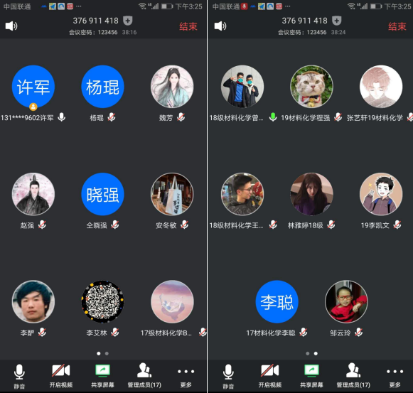 理学院数学系、物理系、统计学系和化学系都分别召开了别开生面的“云端”座谈会,以充分掌握学生对公共基础课与专业课网络教学的反馈。每个系在组织方式和人员组成上各有特色,如化学系在学生参会人员的选择上,邀请了材料化学2019级、2018级、2017级各班班长或学习委员参加;而物理系采取随机抽样的方式从每个教学班选取参加座谈的学生。无论是何种形式的座谈会都为学生吐露真情实感提供了平台,受到了学生的认可。