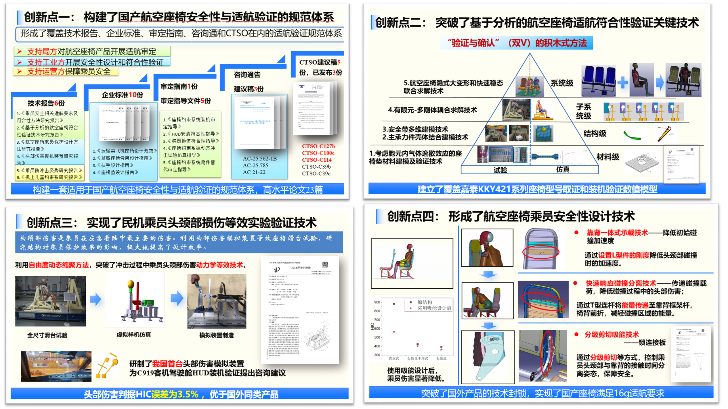 科技创新研究院副研究员解江主持完成了“国产航空座椅安全性设计与适航关键技术研究及应用”获得二等奖。该成果由taptap下载安装安卓、湖北航宇嘉泰飞机设备有限公司、中国民用航空上海航空器适航审定中心、中国飞机强度研究所五家单位合作完成。研究团队实现了利用数值分析支持座椅适航符合性验证试验,为我国工业方降低试验研发成本400万元。在国内首次成功研制了头部伤害模拟装置(HCT)。其中头部伤害判据HIC、头部加速度峰值等指标与全尺寸滑台模型相比,误差于小于10%,可用于头排座椅乘员头部伤害评估。形成了航空座椅乘员安全性设计技术。成果成功应用于具有自主知识产权的国产航空座椅的研发与取证中,航空座椅产品打破了国际垄断,并在B737、A320、国产C919和ARJ21飞机上实现装机了应用,产值超过3亿元。为我国航空座椅符合性验证及适航审定提供了技术支持,为争夺适航国际话语权提供了支撑。