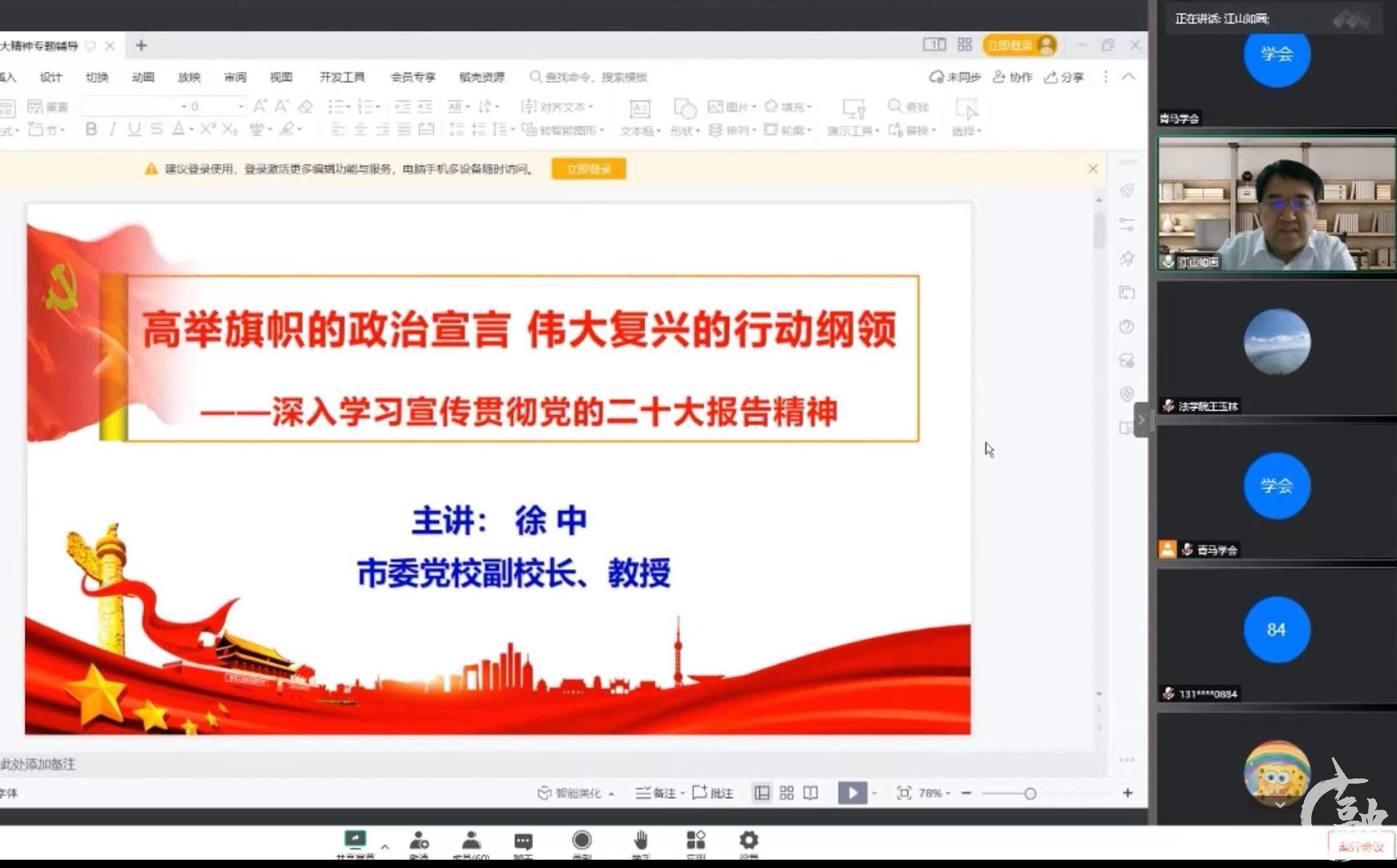 徐中围绕深刻领会党的二十大主题,围绕过去5年工作和新时代10年伟大变革的里程碑意义、习近平新时代中国特色社会主义思想的世界观和方法论、以中国式现代化推进中华民族伟大复兴事业的使命任务、未来一个时期党和国家事业发展的战略部署、以伟大自我革命引领伟大社会革命的重要要求、团结奋斗的时代要求等七个部分,将党的二十大的重大意义以及党的二十大报告的重要内容、蕴含精神予以高度概括,让大家既能坚持全面准确,又能深入理解内涵、精准把握外延。