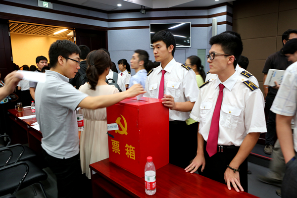 候选人以随机抽签的顺序依次上台演讲,以电脑定时器计时,每人演讲时间为7分钟。会上,每位候选教师做了精彩的演讲,赢得了老师同学们的热烈掌声。演讲环节结束后,评委们依次排好队投出了自己神圣的一票。