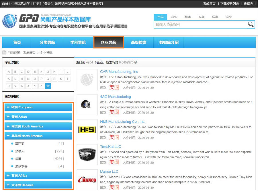 企业导航按照欧洲、亚洲、南美洲、北美洲、非洲、大洋洲一级类目展开,进一步找到发达国家先进制造业的企业及其产品样本。