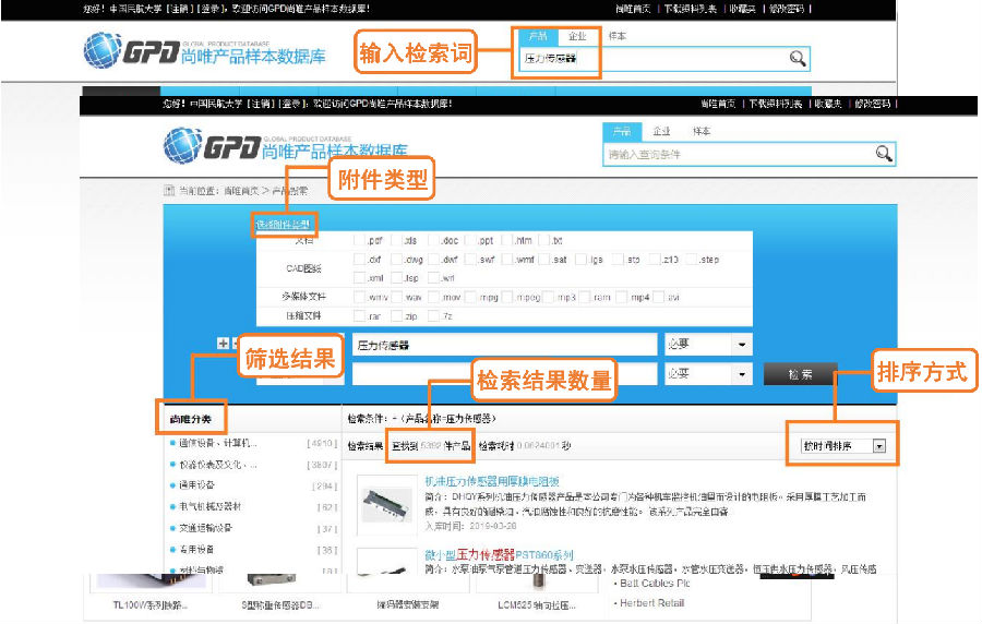 在校园网IP范围内,访问图书馆主页—资源—数据库导航—中文数据库—全球产品样本数据库(http://gpd.sunwayinfo.com.cn)