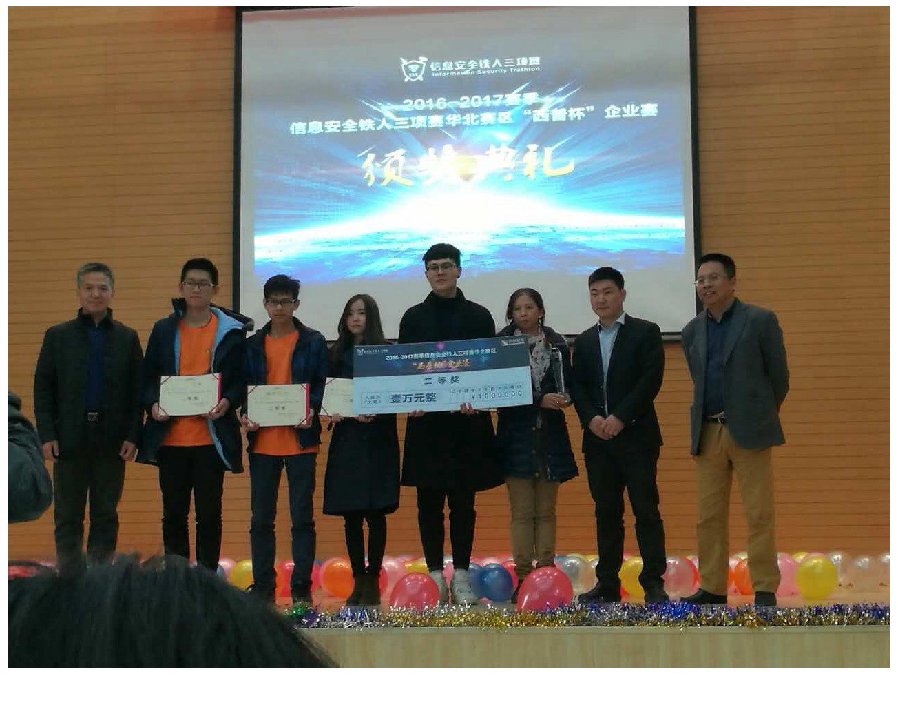 日前,计算机科学与技术学院2013级学生陆宏舟、李韬、施叶林、黄鑫获2017年信息安全铁人三项赛华北赛区—“企业计算环境安全对抗赛”第二名,仅次于北京航空航天大学。