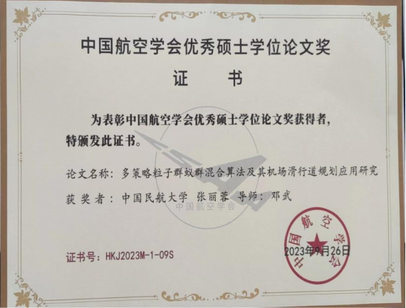 近日,2023(第六届)中国航空科学技术大会在乌镇互联网国际会展中心盛大开幕,开幕式上举办了中国航空学会年度颁奖典礼,我校硕士研究生张丽蓉荣获中国航空学会优秀硕士学位论文奖。获奖学位论文名称为《多策略粒子群蚁群混合算法及其机场滑行道规划应用研究》,导师为邓武教授。