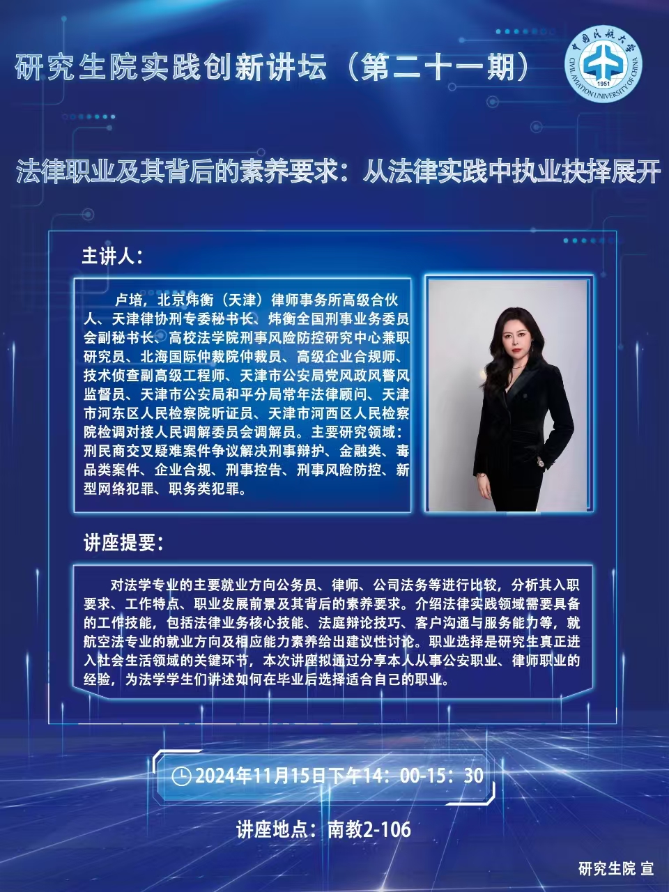对法学专业的主要就业方向公务员、律师、公司法务等进行比较,分析其入职要求、工作特点、职业发展前景及其背后的素养要求。介绍法律实践领域需要具备的工作技能,包括法律业务核心技能、法庭辩论技巧、客户沟通与服务能力等,就航空法专业的就业方向及相应能力素养给出建议性讨论。职业选择是研究生真正进入社会生活领域的关键环节,本次讲座拟通过分享本人从事公安职业、律师职业的经验,为法学学生们讲述如何在毕业后选择适合自己的职业。