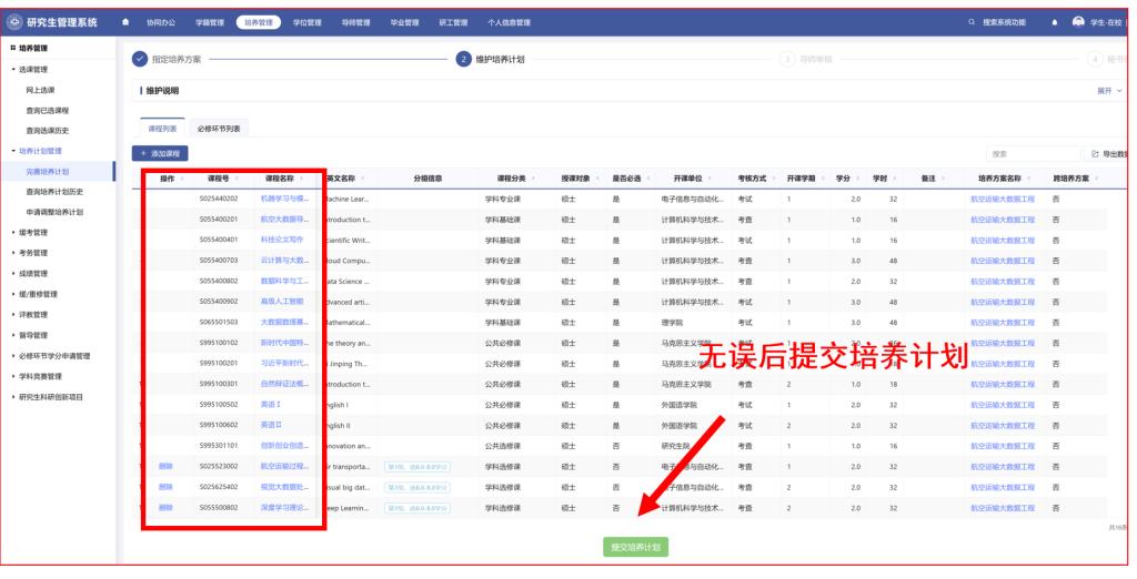 1. 研究生提交培养计划前,须再次核对培养方案中课程设置,由个人原因导致选课出现问题(错选、漏选等)影响后续学业的,个人承担其相应后果;