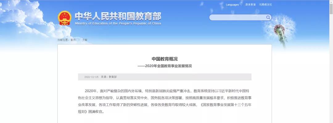 2021年11月15日,教育部发布《中国教育概况——2020年全国教育事业发展情况》,文件中有关高等教育的内容如下:
