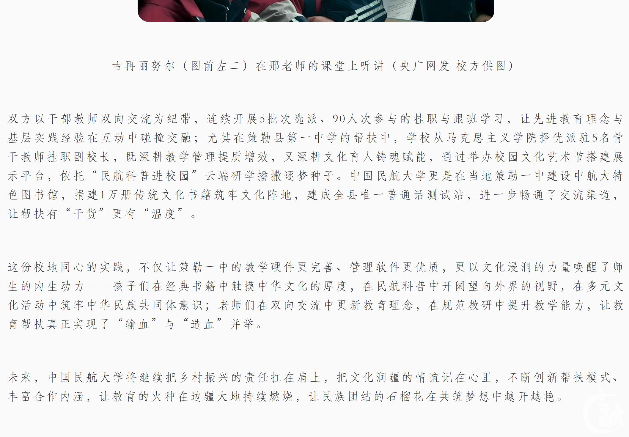 这份校地同心的实践,不仅让策勒一中的教学硬件更完善、管理软件更优质,更以文化浸润的力量唤醒了师生的内生动力——孩子们在经典书籍中触摸中华文化的厚度,在民航科普中开阔望向外界的视野,在多元文化活动中铸牢中华民族共同体意识;老师们在双向交流中更新教育理念,在规范教研中提升教学能力,让教育帮扶真正实现了“输血”与“造血”并举。