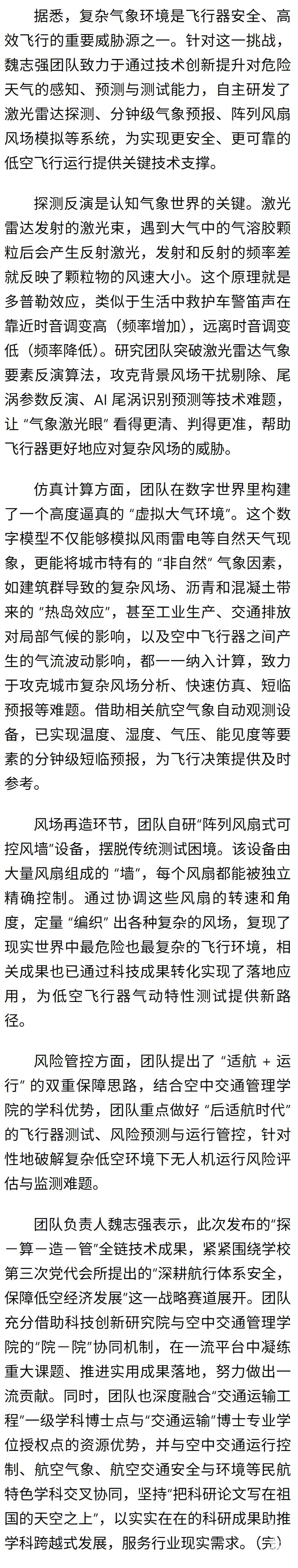 据悉,复杂气象环境是飞行器安全、高效飞行的重要威胁源之一。针对这一挑战,魏志强团队致力于通过技术创新提升对危险天气的感知、预测与测试能力,自主研发了激光雷达探测、分钟级气象预报、阵列风扇风场模拟等系统,为实现更安全、更可靠的低空飞行运行提供关键技术支撑。